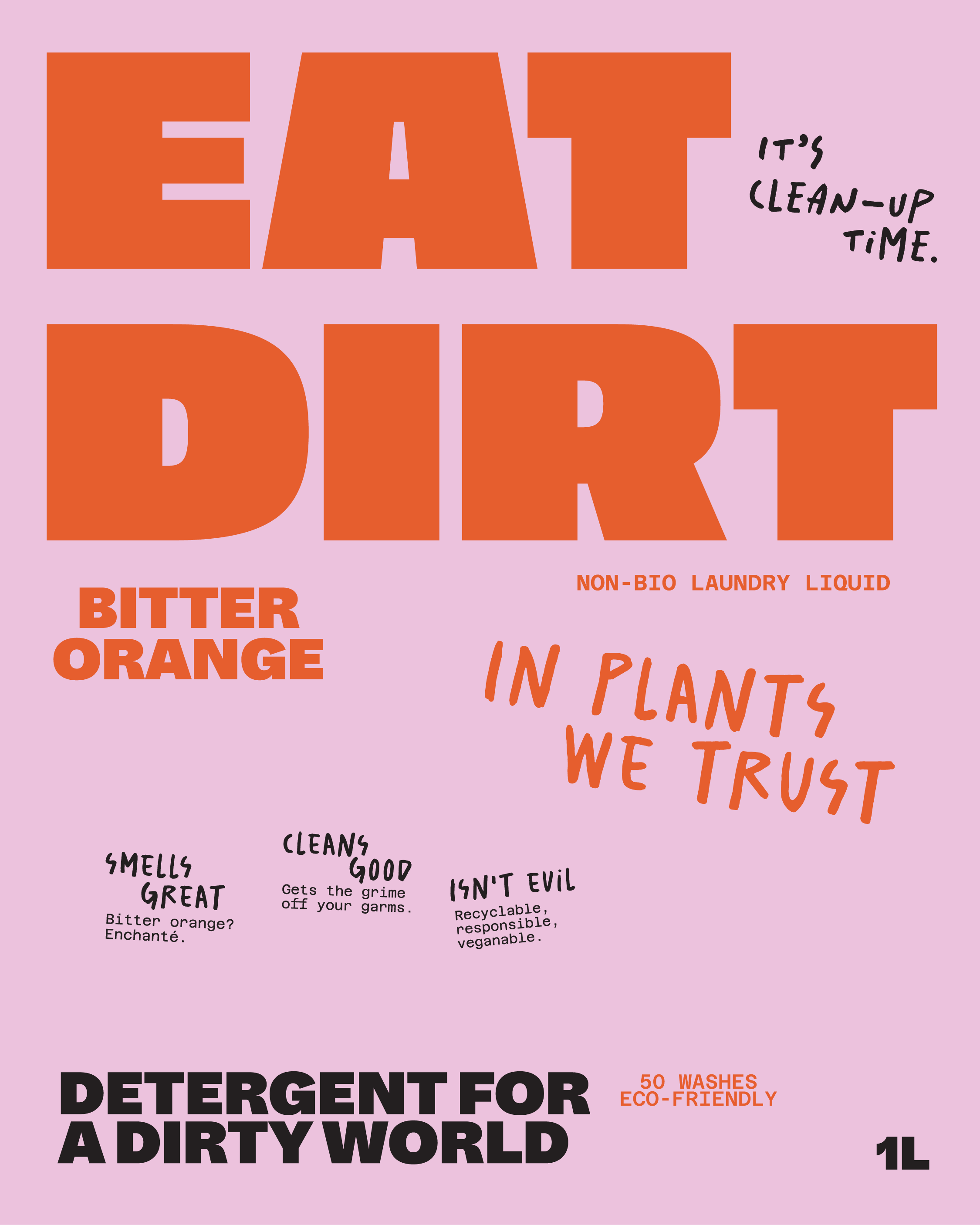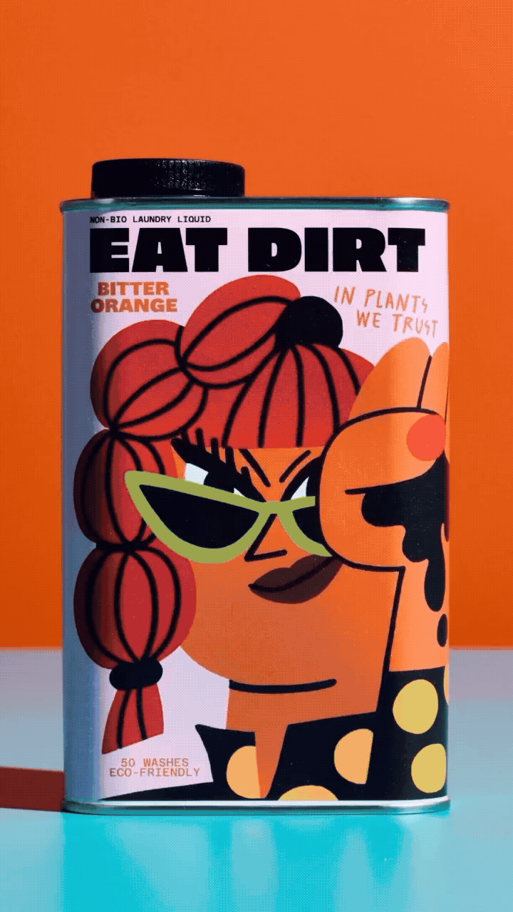 Eat Dirt is the detergent that’ll clean your garms 🫧 bless ‘em with a heavenly scent 🍊 and give Mother Nature a high-five on the way out 🙌 It comes in a 100% recyclable tin and is made from sustainably-sourced, vegan ingredients. This was our brief and we have come up with a bold, daring and provocative identity that you can’t look away.